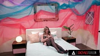 DEVILS TGIRLS: Stunning Trans Jessica Fox Cums on Herself While Having Her Ass Plumbed