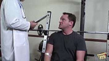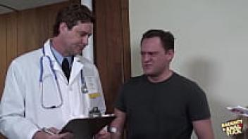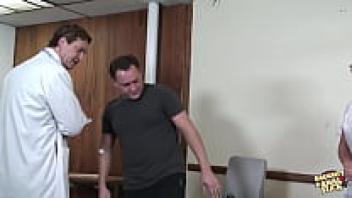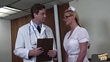 After caring for a patient, a sexy blonde nurse wearing spectacles provides a doctor all the holes.