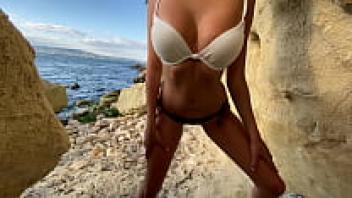 Love on a public beach and a risky outdoor handjob with Busty Beauty