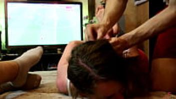 A blowjob with tape bondage and a foot fetish dedicated to a (fan)