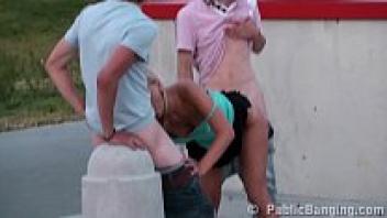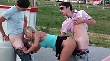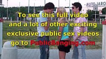 A public gang bang threesome having sex at a train station with Alexis Crystal's face