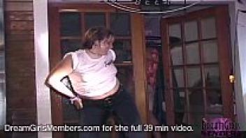 In public, a lustful hair stylist strips and plays with her pussy.