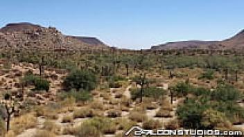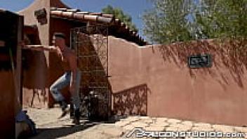 From behind, Nacho is pumping his cock. Jakeline slurps on the director's enormous dick while kneeling.
