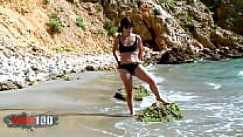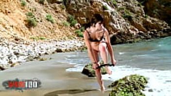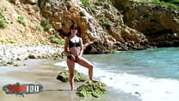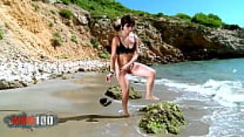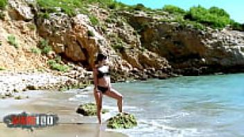 After going to the beach, the ideal brunette with a large ass enjoys getting cumshoot on her breasts.