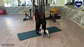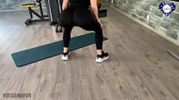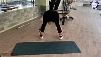 Beautiful babe squirts all over the gym and does the splits on his cock.