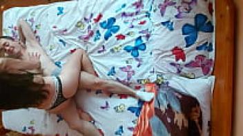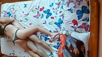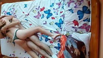 In the bed of her parents, a petite girl is in love with her boyfriend.