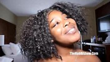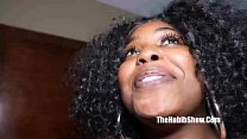 Ebony porn shows a small black woman receiving some assistance from a black behemoth.
