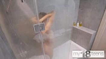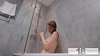 Before masturbating, a skinny girl washes her body in MY18TEENS.