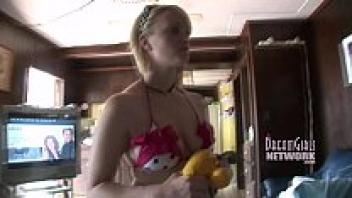 This sexy blonde with a dildo is showing off her nice booty while masturbating on the floor with her hairy pussy. Produced at home