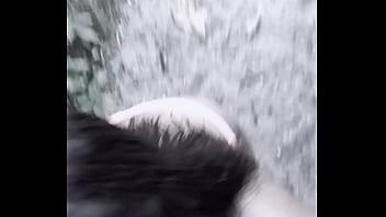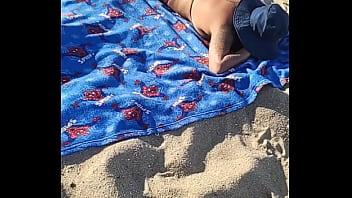 Sucking her husband and getting cum in her face, a hot wife flaunts herself on a public beach. (Eve and Adam).