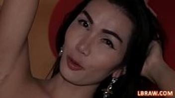 4 A slim Asian ladyboy wearing high heels is adored until he cumshots her enormous tits.