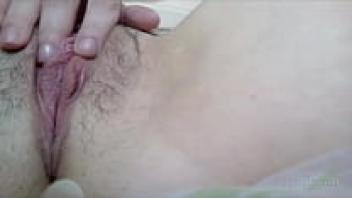 A slender 18-year-old girl is massaging and fingering her tight, hairy pussy.
