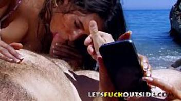 Two gorgeous Latina women have sex on a beach FFMM foursome group.