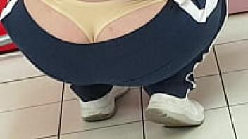 Gorgeous woman wearing pearl thongs, a miniskirt, and stockings, voyeur upskirt camera