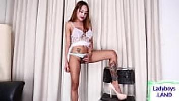 A gorgeous ladyboy in lingerie pulls it out.
