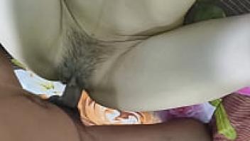 Close-up of a love stepmother's hairy, dripping pussy