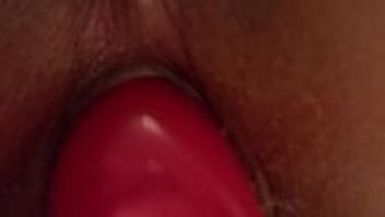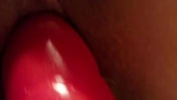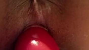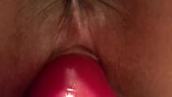 A shaven, horny Chinese girl who adores large dildo