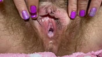 In her underwear, a hairy pussy female with a massive clit masturbates.