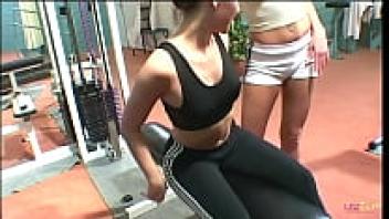 In the gym, aroused lesbian girls are kissing and making love while wearing a strap.