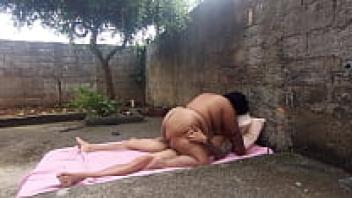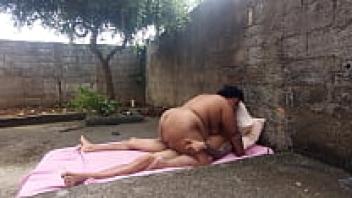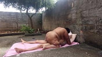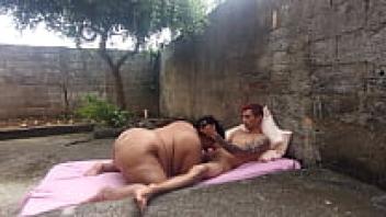 In the backyard, eating the fat married woman