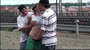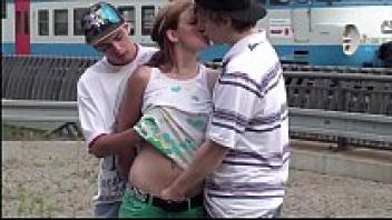 At a train station, a sexy teenage girl named Alexis Crystal engages in a public sex gang bang threesome.