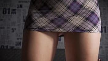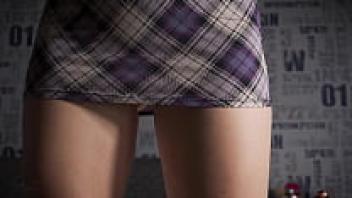 Under a Milf secretary's desk, an upskirt ass is visible through her thighs.