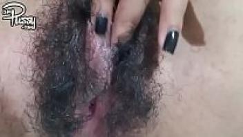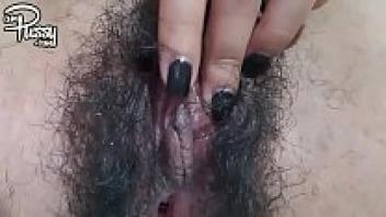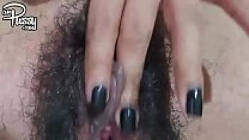 In her underwear, a hairy pussy female with a massive clit masturbates.