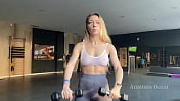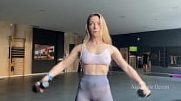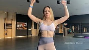 In the gym, a woman wearing a transparent bra performs exercises in front of others. Her nipples are visible.