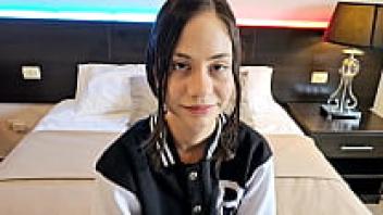 Tiny brunette rides big cock