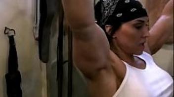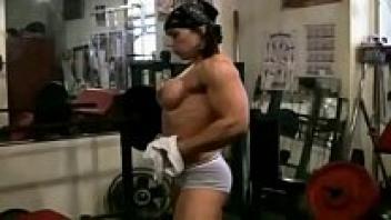 In the gym, a woman wearing a transparent bra performs exercises in front of others. Her nipples are visible.