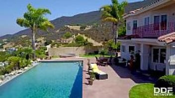 Watch Janice Griffith, a gorgeous and seductive woman, touch her shaved pussy besides the pool.