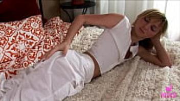 Emilia, the blonde sweetheart, undresses before rubbing and fingering her ass!